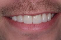 Mellanrum mellan flera framtänder samt trasiga hörn och felaktig lutning på framtänderna. Behandling: Generell blekning samt 6 porslinsfasader.