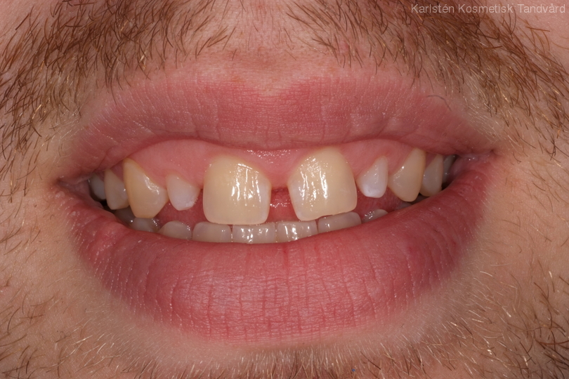 20-årig man med stora mellanrum och oregelbundna tänder. Behandling: Generell blekning samt 4 fasader på framtänderna.