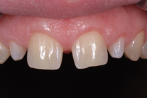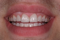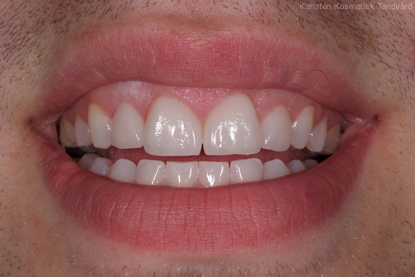 20-årig man med stora mellanrum och oregelbundna tänder. Behandling: Generell blekning samt 4 fasader på framtänderna.