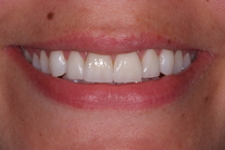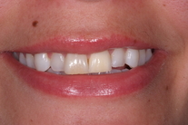 2 framtänder skadade av slag och blivit missfärgade. Dessutom ojämna framtänder. Behandling: Generell blekning samt 4 porslinsfasader.