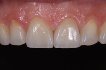 2 framtänder som står bakåttippade. Nötta av tandgnissling. Behandling: Inkorrigering av bettet samt 2 fasader.