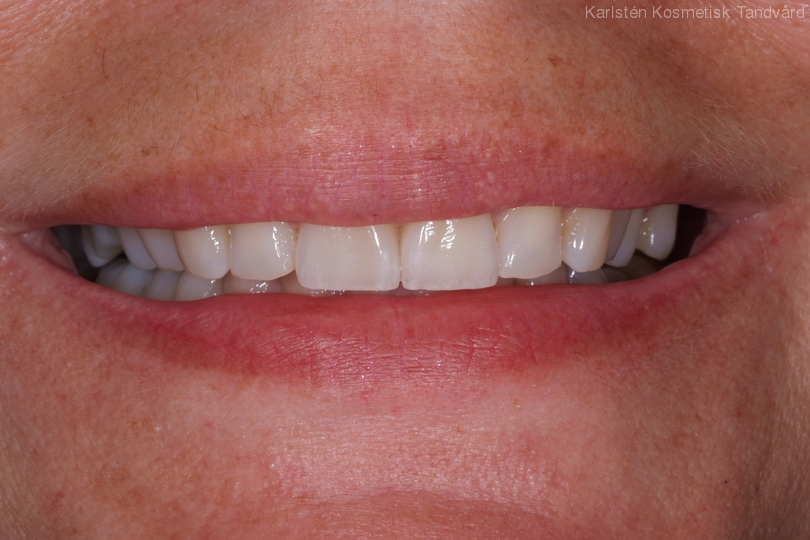 2 framtänder som står bakåttippade. Nötta av tandgnissling. Behandling: Inkorrigering av bettet samt 2 fasader.