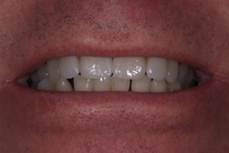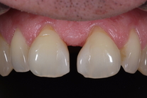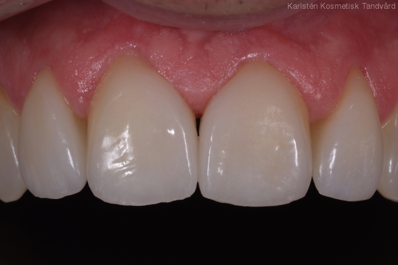 Stort mellanrum mellan framtänderna, tidigare lagat med composite. Behandling: Generell blekning, 2 fasader och 2 kronor.