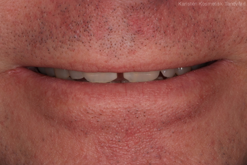 Stort mellanrum mellan framtänderna, tidigare lagat med composite. Behandling: Generell blekning, 2 fasader och 2 kronor.