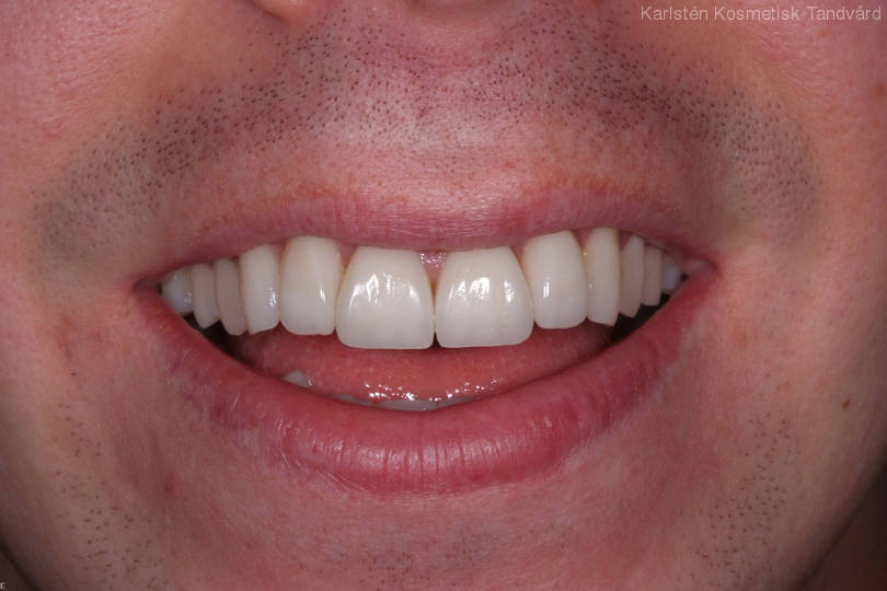 Missfärgade framtänder som pekar åt olika håll. Behandling: Generell blekning samt 4 fasader.