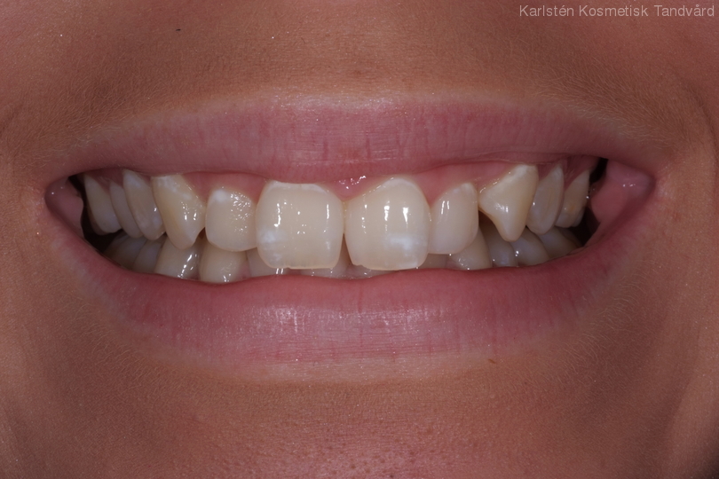 18-årig flicka som är missnöjd med sina framtänder. Behandling: Generell blekning, laserkonturering på 4 framtänder, 4 fasader samt 1 compositefyllning på hörntand.