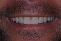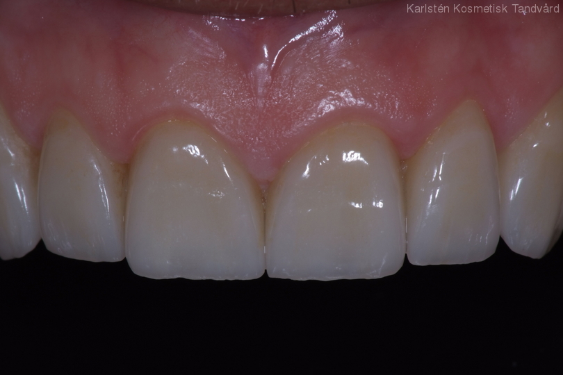 Slitna framtänder och muskelspänningar i käkarna. Behandling med generell blekning, 5 kronor och 6 fasader i överkäken.