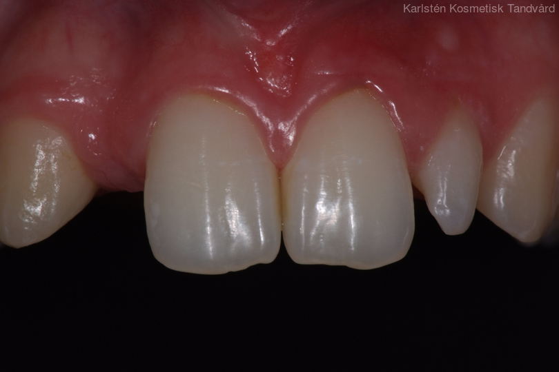 19-årig kvinna som saknar en framtand samt har en missformad tapptand. Behandling: Generell blekning, 3 fasader och bro med 3 tänder.