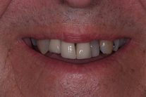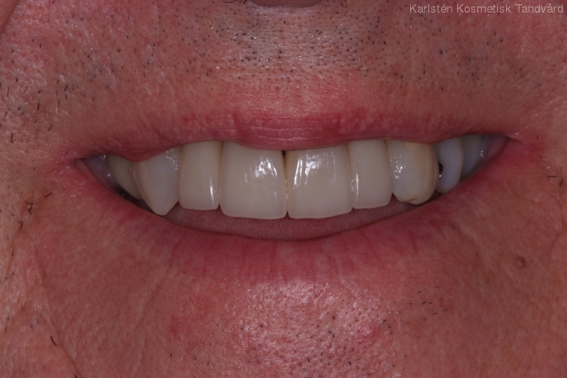 Man med missfärgade och trångställda framtänder. Behandling: Generell blekning samt 4 kronor.