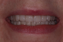 Missfärgade och skadade tänder samt ett kollapsat bett. Behandling med 22 porslinskronor samt en bro.