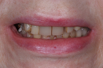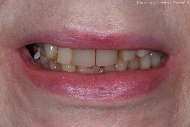 Missfärgade och skadade tänder samt ett kollapsat bett. Behandling med 22 porslinskronor samt en bro.
