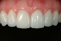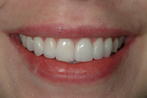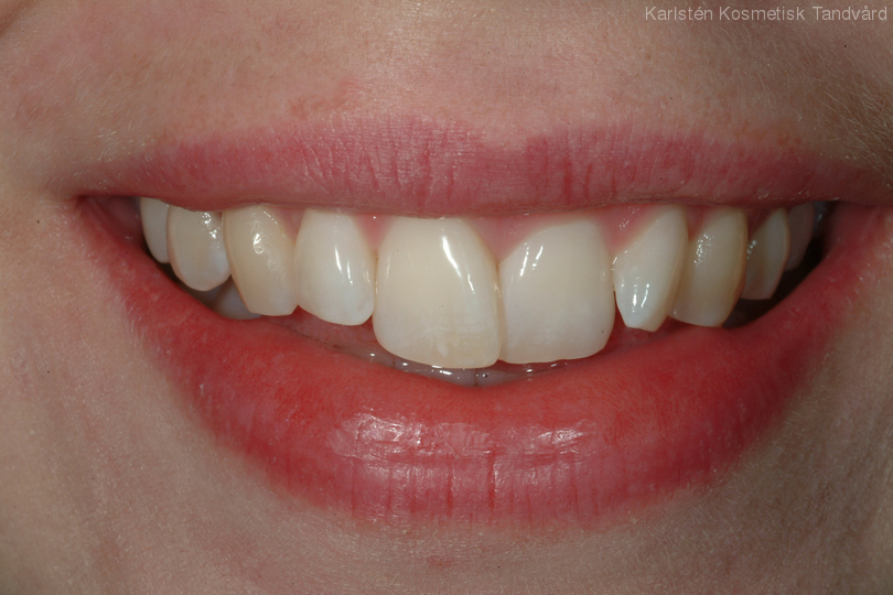Trångställda, ojämna tänder. Behandling: Generell blekning samt 6 fasader.