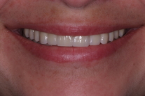 Glest mellan framtänderna och gulnade tänder. Behandling: 13 kronor, 8 fasader och 2 broar med 7 tänder i helkeramik.