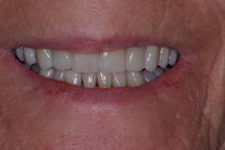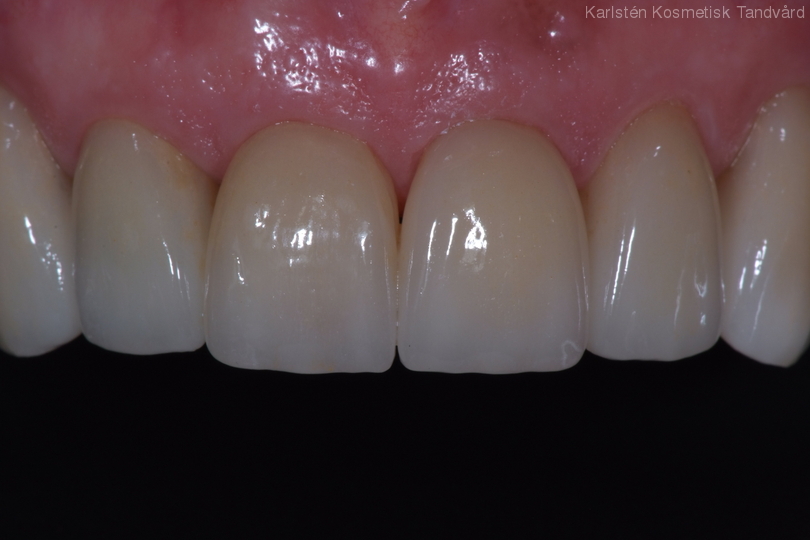 Diverse tänder med varierande färg. Bettfunktionsfel med många trasiga tänder. Behandling: Blekning i underkäken samt 16 kronor för att återskapa ett stabilt bett.