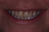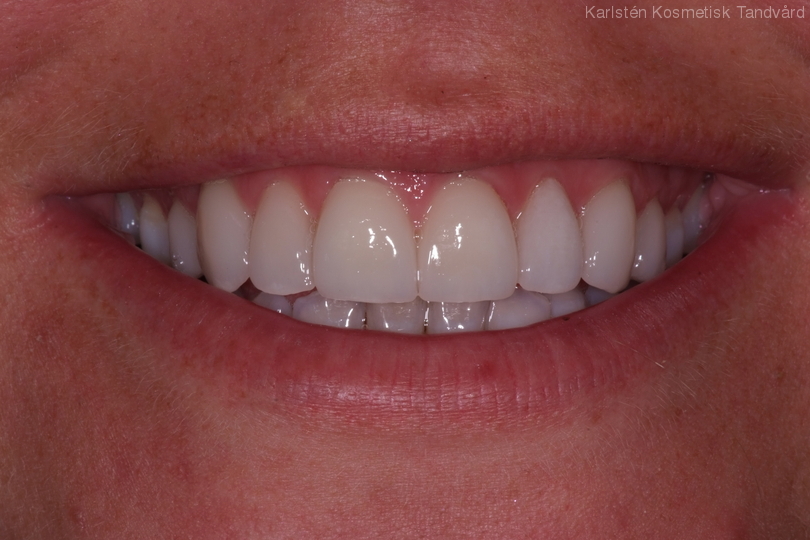 Ung kvinna med missfärgade compositefasader. Behandling: Generell blekning, 2 fasader samt 6 kronor i överkäken.