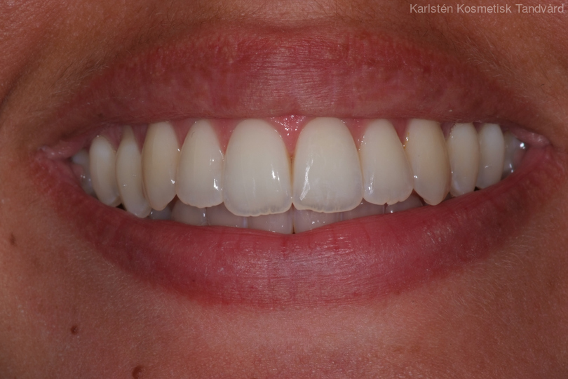Ung kvinna som tidigare haft tandreglering. Upplever inte att tänderna står i en fin tandbåge. 11 månaders behandling med genomskinliga Invisalignskenor resulterade i ett fint leende.
