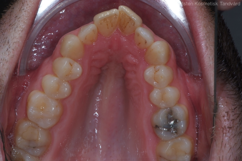 35-årig man med smal och trångställd tandbåge. Vill ha ett jämnt leende. Behandling bestod av knappt 9 månader med genomskinliga Invisalignskenor.