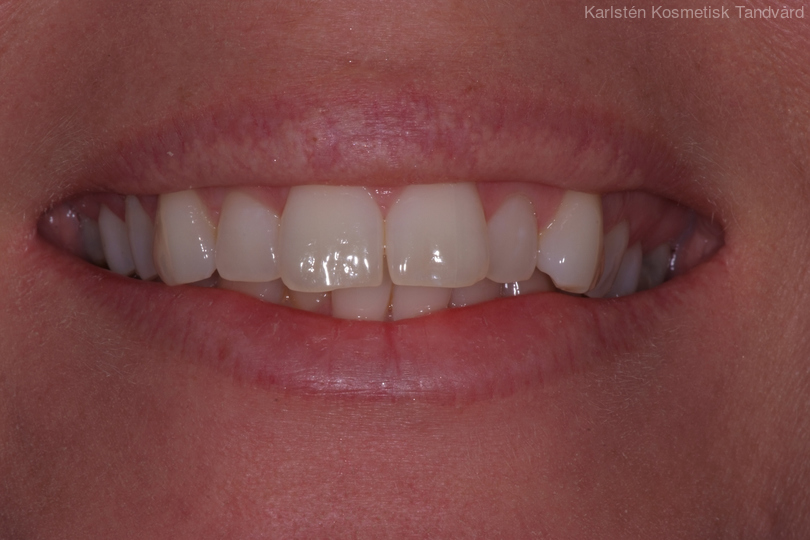 40-årig kvinna som tycker att de två framtänderna står ut framför alla andra tänder. Behandlingen bestod av 11 månader med genomskinliga Invisalignskenor.