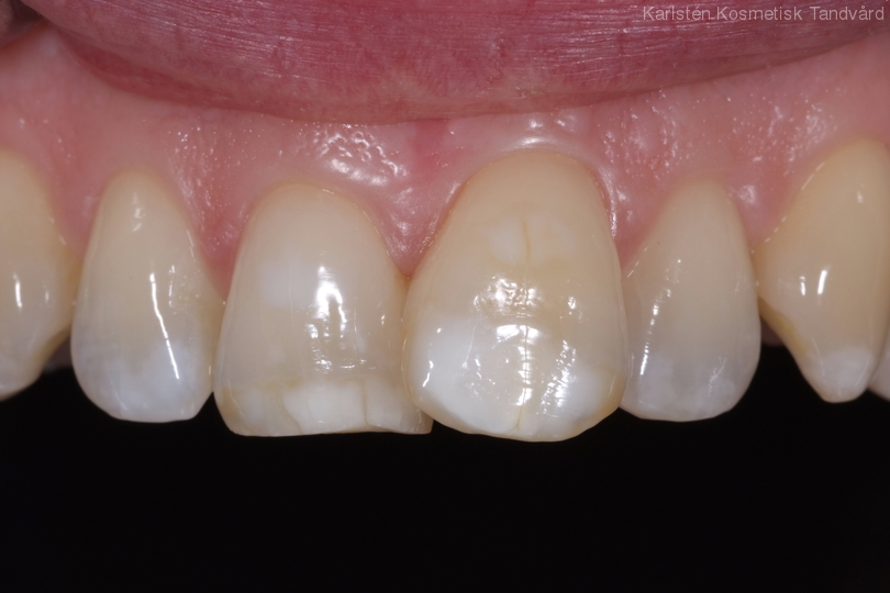 Önskemål om jämnare tandrad. Behandling: Generell blekning, laserkonturering av tandköttet samt 4 fasader.