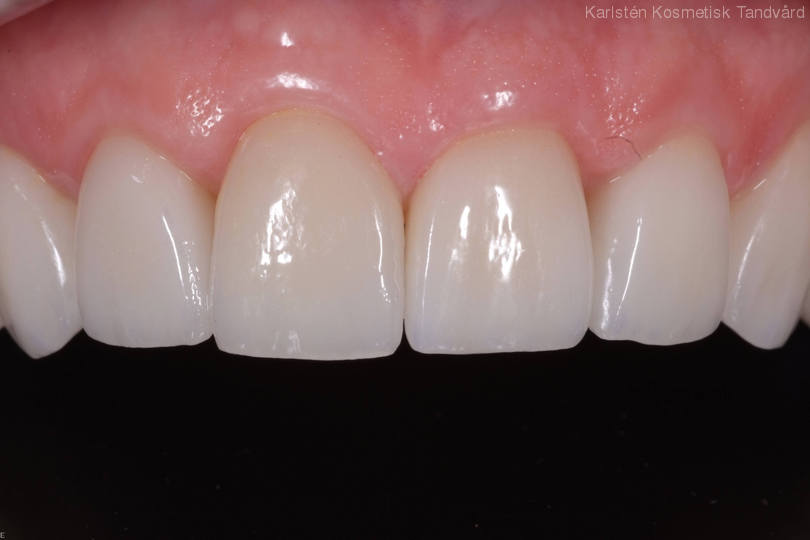 Assymetriska framtänder. Önskemål fanns om mer symmetri. Behandling: Generell blekning samt 5 fasader och 1 krona