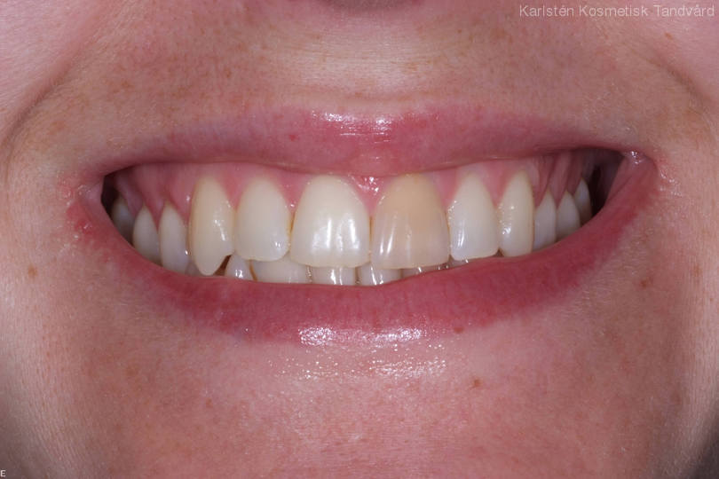 Kraftigt missfärgad framtand där önskningar finns om lite mer symmetri. Behandling: 1 krona och 1 fasad.