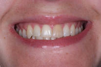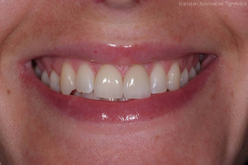 Kraftigt missfärgad framtand där önskningar finns om lite mer symmetri. Behandling: 1 krona och 1 fasad.