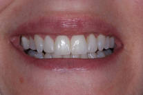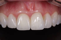 Ojämna och assymetriska rotfyllda framtänder. Behandling: Generell blekning, höjning av tandköttet, 2 fasader och 2 kronor.