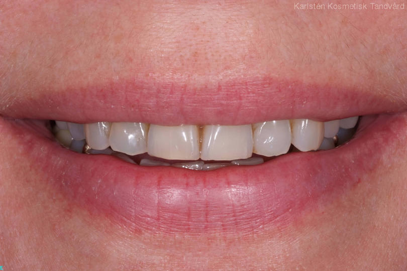 Spricka i framtandsrot gjorde det nödvändigt att ta bort tanden. Behandling: Ersattes med TandNu, dvs med ett implantat där tanden kan användas direkt samt generell blekning och 3 framtandsfyllningar.
