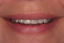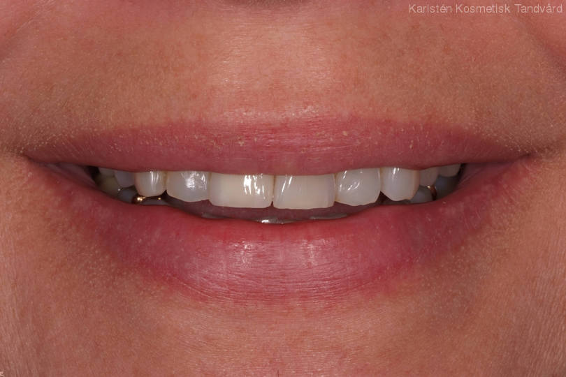 Spricka i framtandsrot gjorde det nödvändigt att ta bort tanden. Behandling: Ersattes med TandNu, dvs med ett implantat där tanden kan användas direkt samt generell blekning och 3 framtandsfyllningar.