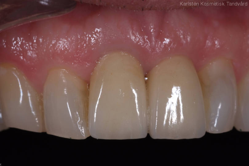 2 framtänder som måste tas bort ersätts av 2 implantat. Behandling: Framtänderna ersätts med TandNu, dvs direkt användbara tänder som sätts in samtidigt som dom dåliga tänderna tas bort.