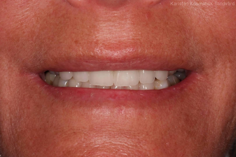 6 gamla plastfasader med inflammation i tandköttet pga dåliga skarvar. Behandling: Generell blekning samt 6 porslinsfasader.