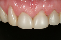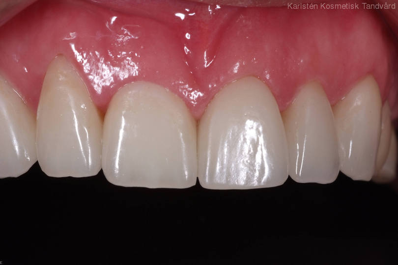 6 gamla plastfasader med inflammation i tandköttet pga dåliga skarvar. Behandling: Generell blekning samt 6 porslinsfasader.