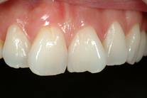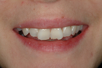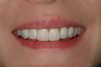 Nötta och slitna tänder med lite felställning. Behandling: Generell blekning samt 5 fasader i överkäken.