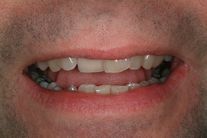 1 framtand i överkäken måste tas bort pga spricka i roten. Behandling: Generell blekning, 1 implantat med 1 krona samt 1 fasad på den andra framtanden för att erhålla en jämnare tandrad.