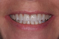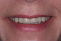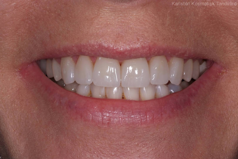 Fasader utförda som inte kändes bra. Visst instabilt bett. Behandling: 12 porslinskronor i överkäken och 4 i underkäken medförde ett nytt utseende samt ett bett i balans.