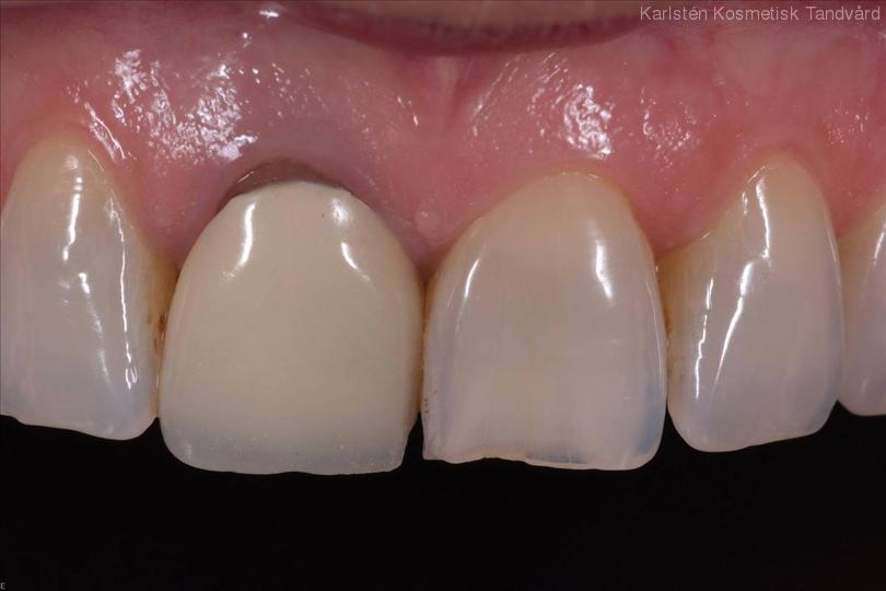 Kraftigt missfärgad rotfylld framtand samt även slitna tänder. Behandling: 1 krona och 1 fasad.