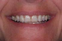 Patient som är missnöjd med trasig framtandsfyllning, trasiga tänder bak i munnen samt missfärgningar. Behandling: Generell blekning, 2 porslinskronor baktill i munnen, 1 framtandsfyllning och finkonturering av befintliga tänder.