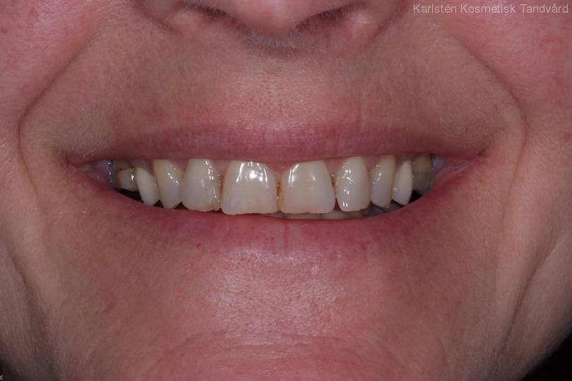 Patient som är missnöjd med trasig framtandsfyllning, trasiga tänder bak i munnen samt missfärgningar. Behandling: Generell blekning, 2 porslinskronor baktill i munnen, 1 framtandsfyllning och finkonturering av befintliga tänder.