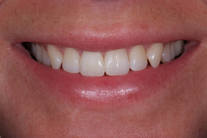 1 framtand står snett bakom den andra i tandbågen samt är skadad sedan tidigare. Patienten har dessutom en hel del huvudvärk. Behandling: 1 tandfasad utbyggd i tandbågen och bettkorrigering har lett till ett stabilt bett med betydligt mindre huvudvärk.