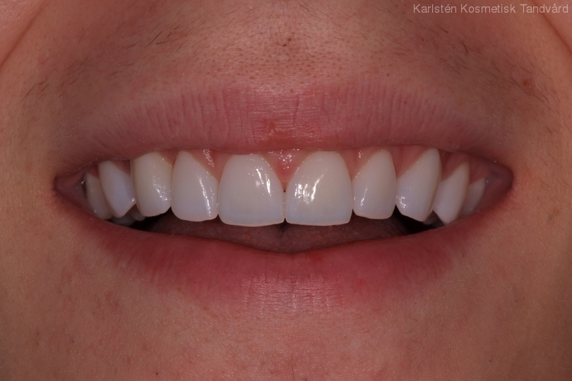 Ung man med glesa tänder i både över- och underkäken. Behandling: Generell blekning, 8 fasader i överkäken och 6 fasader i underkäken.