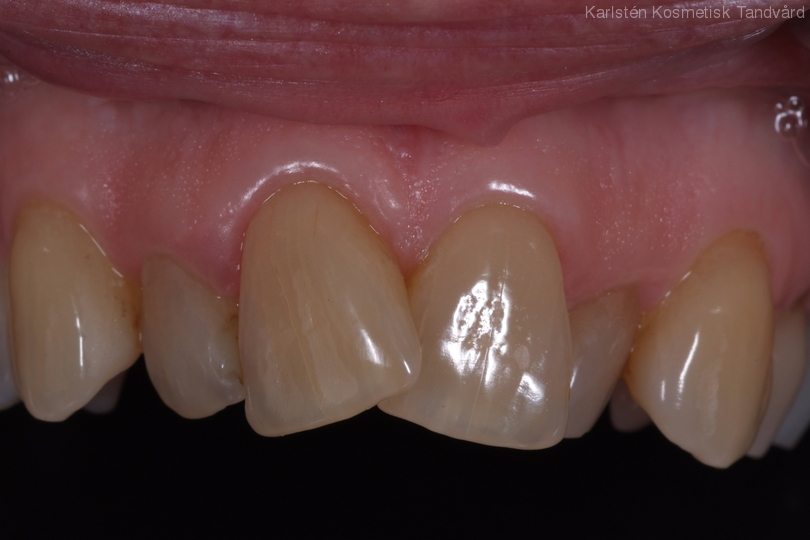 Kraftig trångställning och missfärgade tänder. Behandling: Generell blekning och 6 fasader i överkäken.