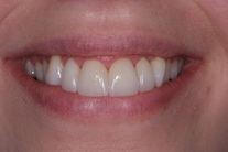 Missfärgade, trasiga framtänder. Behandling: Generell blekning samt 4 fasader.