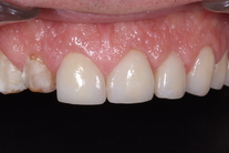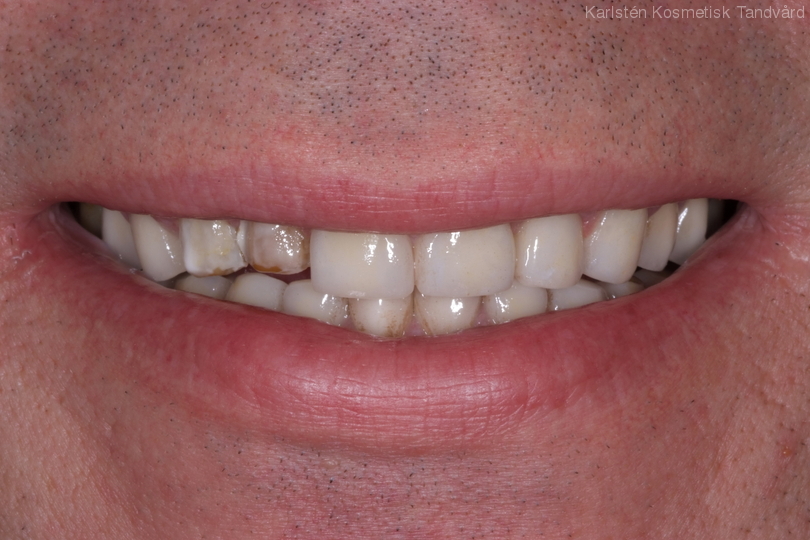 Gamla fasader som inte fungerar i bettet samt lossnar. Behandling: 28 tänder uppbyggda i en korrekt position samt höjning av bettet.