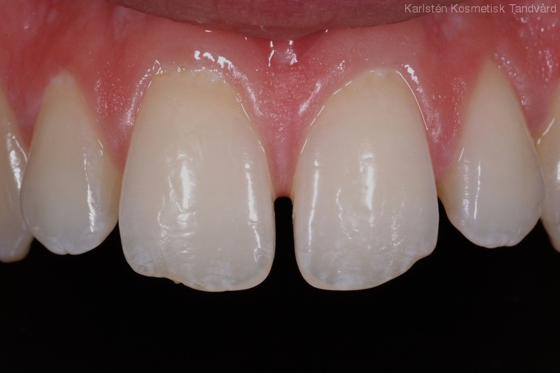 Glesa framtänder med mellanrum. Behandling: Generell blekning samt 4 fasader i överkäken.