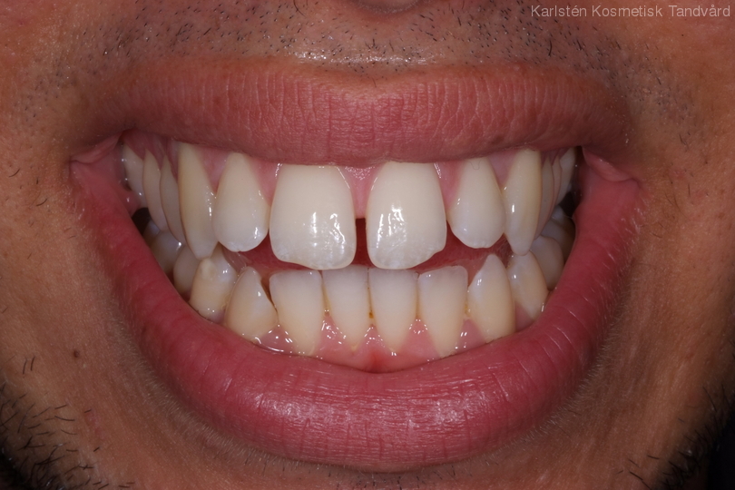 Glesa framtänder med mellanrum. Behandling: Generell blekning samt 4 fasader i överkäken.