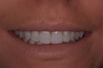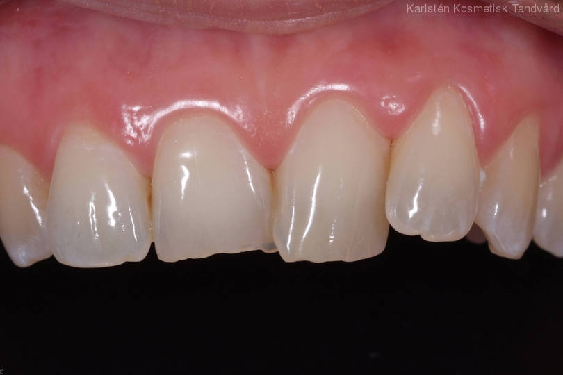 Trångställda och slitna framtänder. Behandling: Generell blekning, bettkorrigering samt laserkonturering av tandköttet och 5 fasader.
