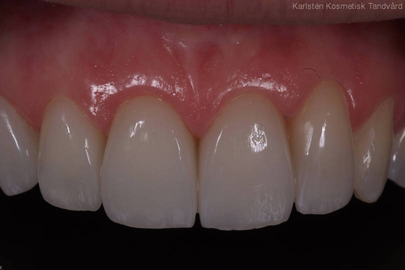 Trångställda och slitna framtänder. Behandling: Generell blekning, bettkorrigering samt laserkonturering av tandköttet och 5 fasader.