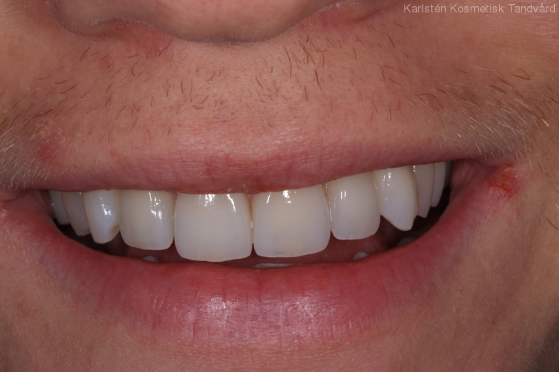 Glesa tänder som pekar åt olika håll samt är något skadade. Behandling: Generell blekning samt 4 fasader.