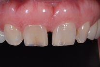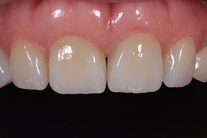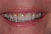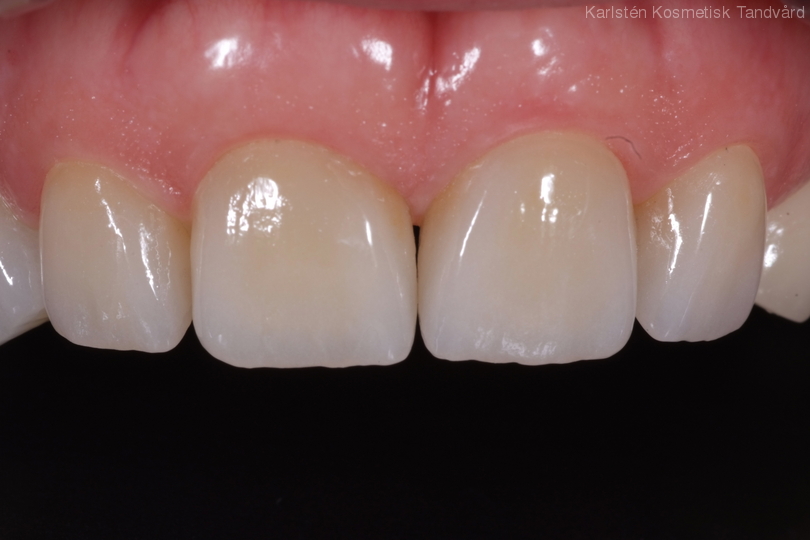 Missnöjd med glesa och slitna framtänder. Behandling: Generell blekning, laserkonturering av tandköttet samt 4 fasader och 1 krona.