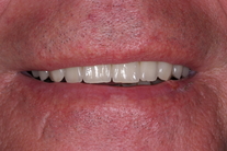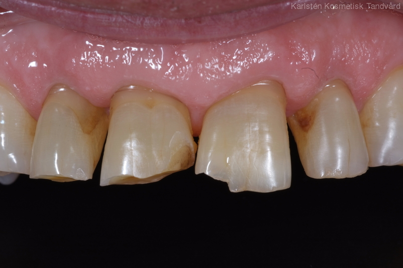 Kraftigt slitet och gnisslat bett. Behandling: 10 porslinskronor i överkäken.